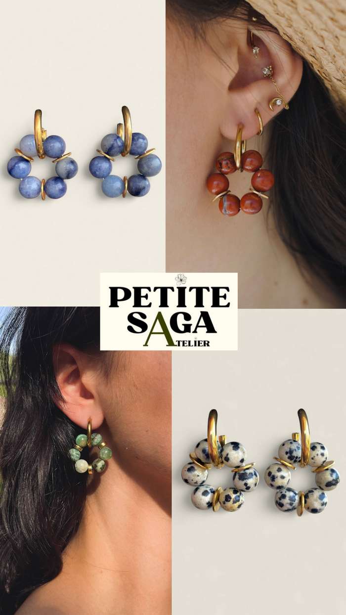 grenat rouge et doré, aventurine bleue et anneaux dorés ou en jaspe et modèles dalmatiens.